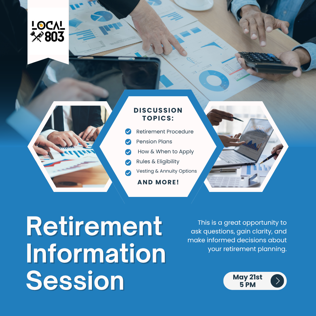 We are pleased to invite you to join us for an upcoming Retirement Information Session designed to help you better understand and plan for your future. This event will be especially valuable for travelers, apprentices, and all union members who want to learn more about the retirement process and the benefits…
